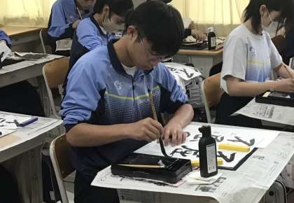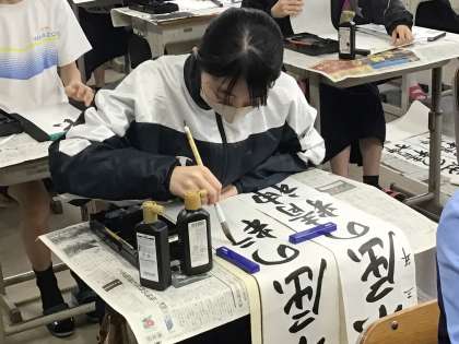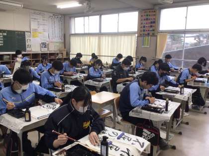 書き初め大会では、全員黙々と机に向かい真剣に取り組んでいました。冬休みを経てとても上達している生徒も見られました。