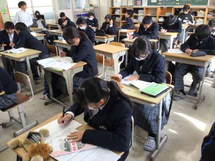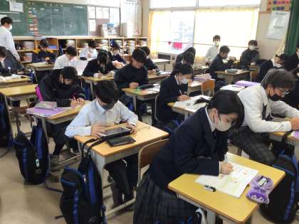 水曜日から始まる学年末テストに向けて、各クラスの議員さんの呼びかけで、休み時間に勉強しています。「結果を出すために、何にTRYするか」を考えて実践しています。