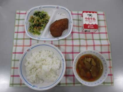 今日は、『ごはん、牛乳、ほっけフライ、アーモンドあえ、かしわ汁』でした。