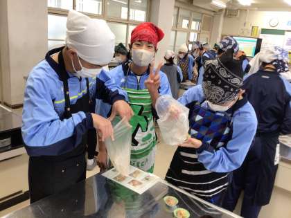 写真は、『コーンしゅうまい』と『ほうれん草のナムル』を作る様子です。