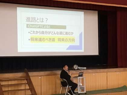 進路指導主事の北川先生から、進路についてお話をしていただきました。夢に向かって日々歩むための気持ちが高まる時間となりました。今日のお話をきっかけに、学習面や生活面で,前のめりに学校生活を送っていきましょう。