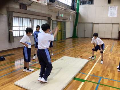 明日から4連休です。今日も体育で元気いっぱいに活動しています。今日は1.2組で体力テストの立ち幅跳びに挑戦しました。