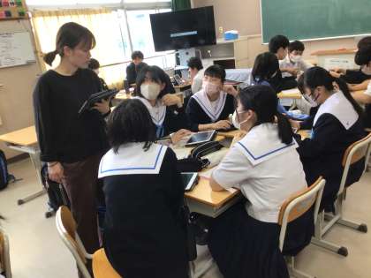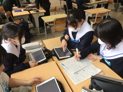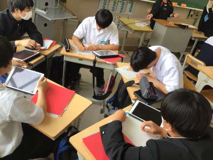 タブレットを用いて、目的地までの電車の時間や行き方を調べたり、観光する場所を考えたりしています。