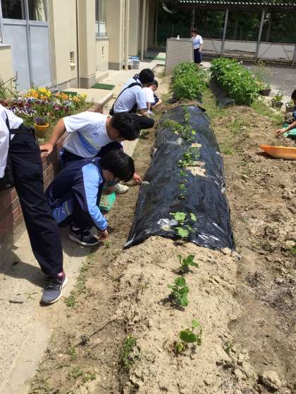 野菜は、毎日朝と帰りに自主的に水やりをしてくれる生徒のおかげですくすく育っています。