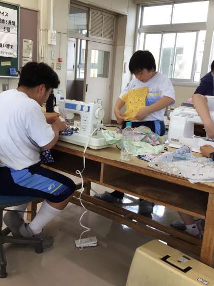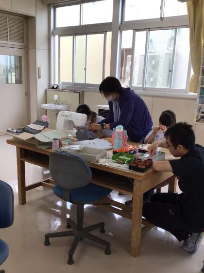 今日も紐通しやミシン、線をつける。などそれぞれの役割を頑張りました。