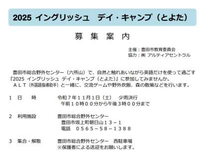 豊田市教育委員会より、イングリッシュデイキャンプのお知らせが届きました。