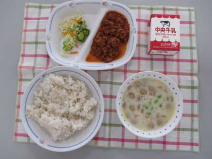 今日の給食は、「麦ごはん、牛乳、豆3(まめまめまめ)のスープ、タコライスの具、タコライスの野菜」でした。