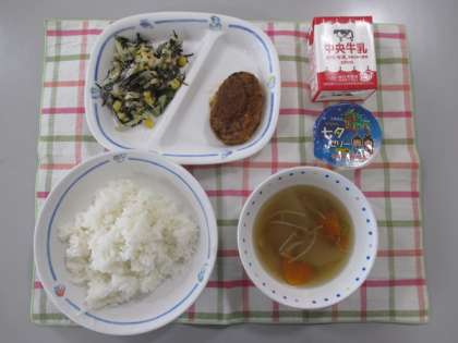 今日の給食は、「ごはん、牛乳、天の川汁、ハンバーグのおろしソースかけ