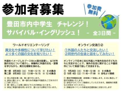 豊田市教育委員会より、「サバイバルイングリッシュ」の参加者募集が届いています。
