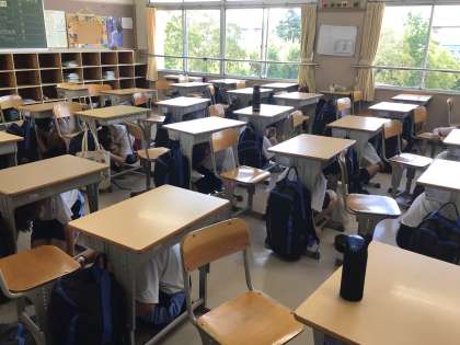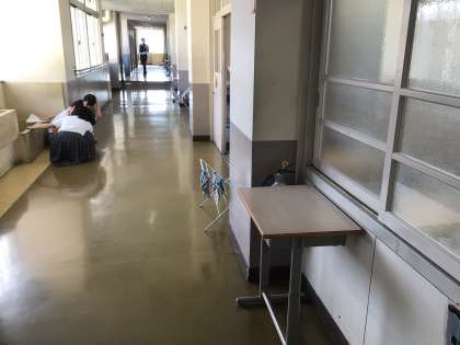 1時間目の避難訓練では、より本番の状態に近づけるために、訓練の時間を伝えず、先生たちが近くにいない状態で行いました。