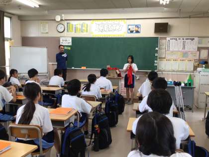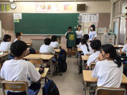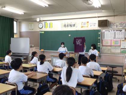 3年生の衣装長が中心となり、1年生の教室に組団Tシャツを届けました。