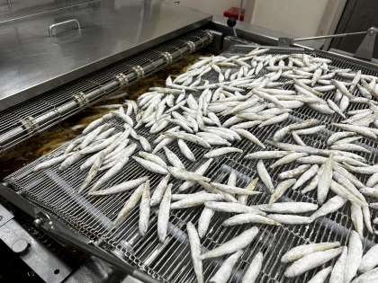 写真は、わかさぎのから揚げをあげている様子です。わかさぎは、骨ごと食べられる小魚なので、たくさんのカルシウムをとることができます。