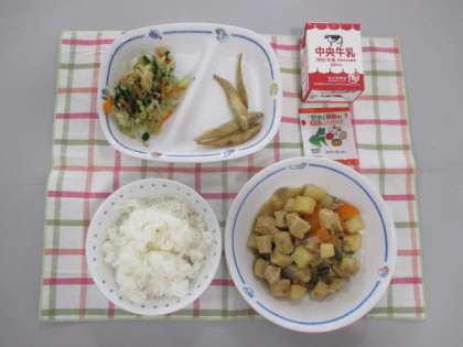 今日の給食は、「ごはん、牛乳、高野豆腐のうま煮、わかさぎのから揚げ、おひたし、ふりかけ(野菜と雑穀)」でした。今日は、私も1年1組に入って給食を食べました。