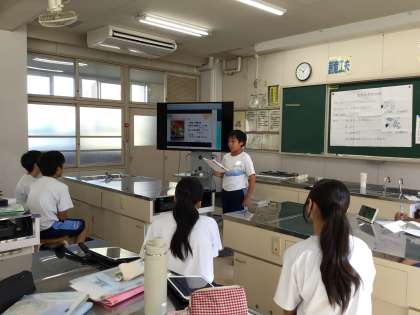夏休みの課題で作った『マイ弁当』について、発表会をしています。