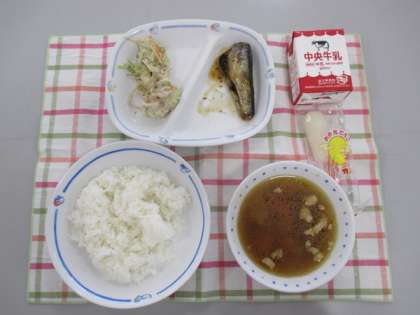給食は、「ごはん、牛乳、いものこ汁、いわしのしょうが煮、ごぼうサラダ、月見だんご」でした。