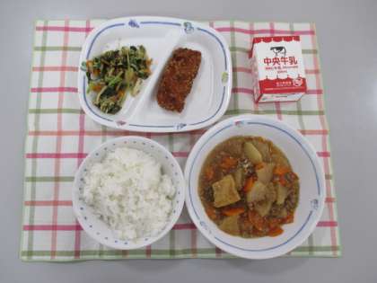 投稿が遅れてしましましたが、先日の給食は「ごはん、牛乳、だいこんのそぼろ煮、いかフライ、おかかあえ」でした。