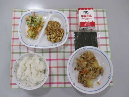 今日の給食は「ごはん、牛乳、肉じゃが、納豆あえ、甘酢あえ、手巻きのり」でした。