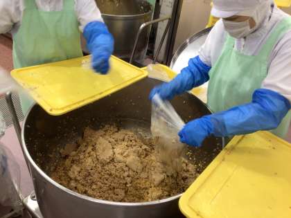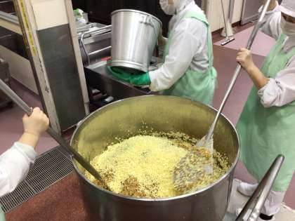 ネバネバしていて重たいので、とても大変な作業ですが、皆さんにおいしい給食を食べてもらうために一生懸命作っています。