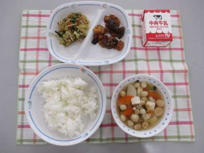 昨日の給食は「ごはん、牛乳、ふだま汁、レバーとさつまいもの甘辛煮、おかかあえ」でした。