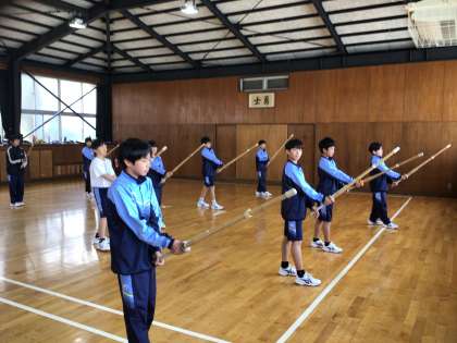 体育の授業で、剣道を勉強しています。礼儀作法を行い、相手を尊重する気持ちをより意識して学習することができています。