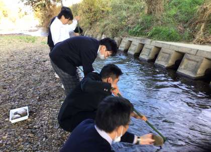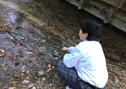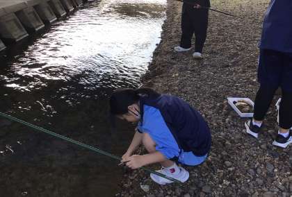 長い棒を持ち、地面や川の深さを確認しながら活動しました。