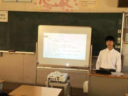 総合で行っていた職業調べのまとめとして、発表会を行いました。生徒は、自分の目指したい職業の特徴や、テーマに合わせて考えたことを発表していました。また、友達の調べた内容について、感想を書き、他の職業に興味をもつ生徒もいました。職場体験学習に向けて話す生徒もおり、働くうえで、必要な心構えを高める時間ともなりました。