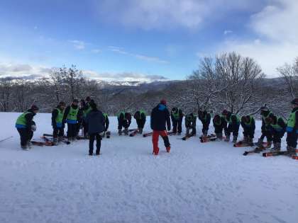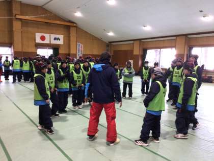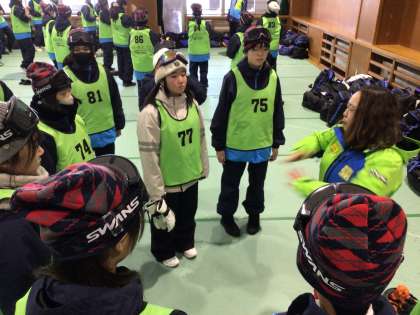 スキー研修の開校式を終え、次はブーツと板合わせです。