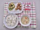 栄養教諭からお知らせです。 今日の給食は「ごはん、牛乳、とり肉のおろしソー...