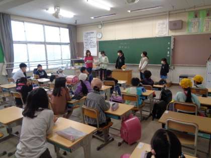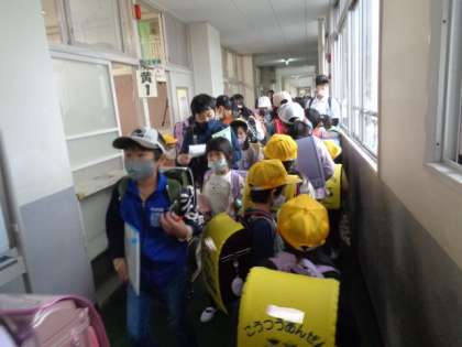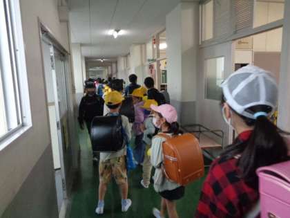 第1回目の通学団会です。 高学年の児童が、1・2年生を迎えに行ってくれました。