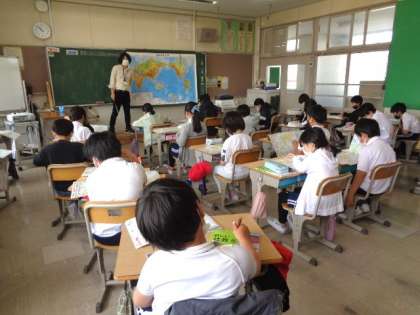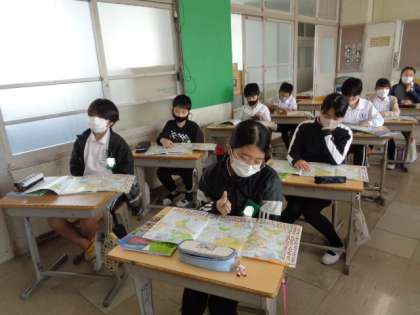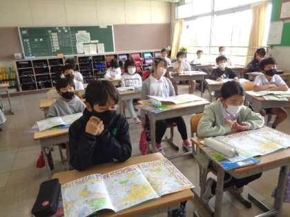 4/14 社会(5年生) 公開日 2023/04/14 更新日 2023/04/14 校長室から 「わたしたちの国土」 世界の主な大陸や海、日本との位置関係等について、地図を見ながら、みんなで確かめていました。