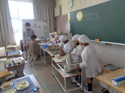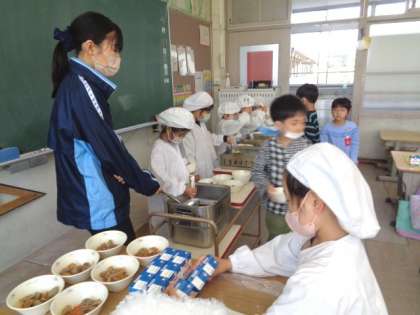 手をしっかり洗って給食です。 給食当番も自分たちで行っています。