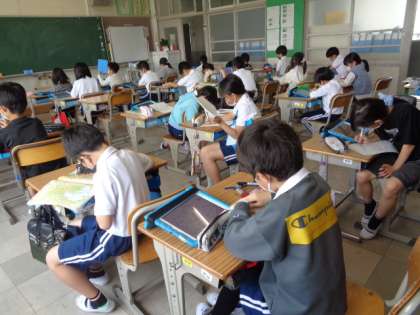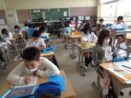 4/21 社会(4年生) 公開日 2023/04/21 更新日 2023/04/21 校長室から 「わたしたちの県」 タブレット等を使って、それぞれのテーマについて調べます。 それぞれが調べたことを愛知県の地図に書き込んでいました。