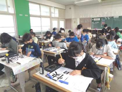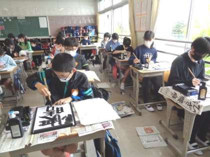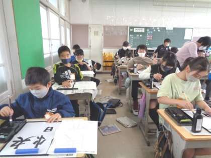 「快晴」 毛筆の学習です。 筆づかいに気をつけながら、何度も練習していました。