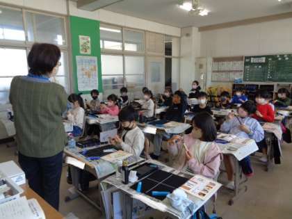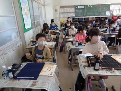 3年生から毛筆が始まります。 初めに道具の使い方など、基本的なことを学習していました。