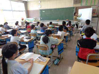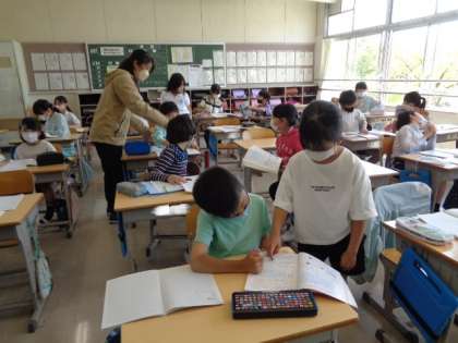 「折れ線グラフ」 教科書の折れ線グラフを見て、変わり方の様子を調べ、友だちとも確認し合っていました。