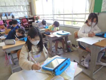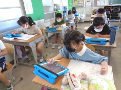 タブレットを使い、農業・産業・交通・観光など、様々なテーマで調べていました。