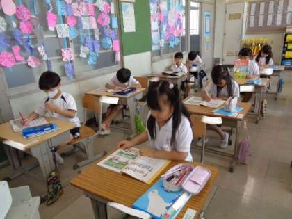 「なんばんめ」 前や後ろから何番目か考えながら、教科書に色をぬっていました。