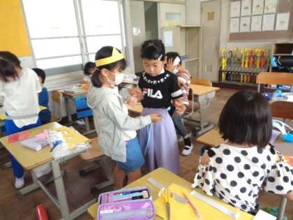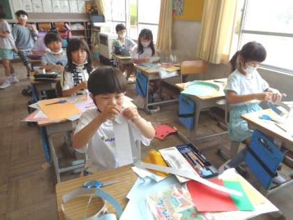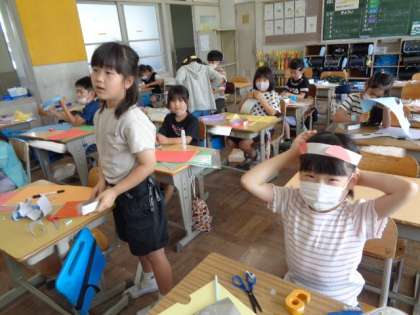 5/22 図画工作(2年生) 公開日 2023/05/22 更新日 2023/05/22 校長室から 「わっかでへんしん」 画用紙を切ってわっかを作り、色や飾りで装飾します。 どんなふうに変身するか、想像をふくらませながら楽しんで作っていました。
