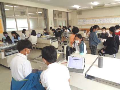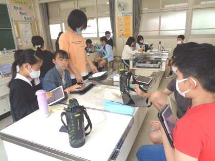 いろいろな銘柄のお米を炊いて食べ比べ、感じたことをまとめたり、それぞれの疑問等をタブレットで調べたりしていました。