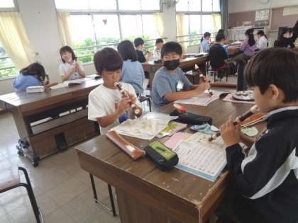 5/25 音楽(5年生) 公開日 2023/05/25 更新日 2023/05/25 校長室から 「小さな約束」 リコーダーの音が重なり合う曲です。 音の響きを感じられるように、みんなで練習していました。