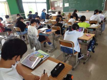 お米の作り方について、資料やタブレットを使って調べ、プリントにまとめていました。