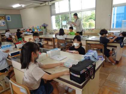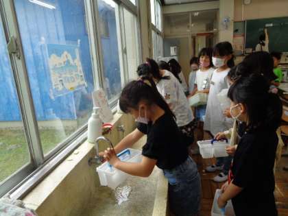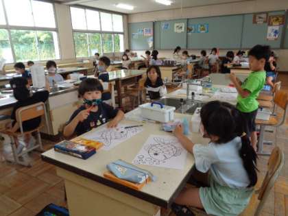 絵の具を使って、魚を虹色にぬる活動です。 水彩絵の具の使い方について、ていねいに確認していました。