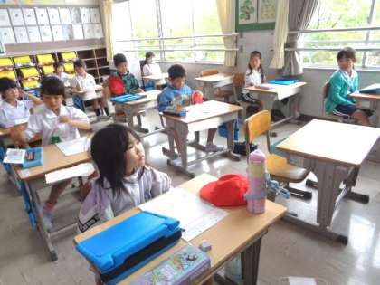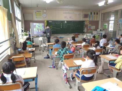 育てているアサガオの成長を観察しています。 タブレットで写真を撮り、観察日記を書いていました。