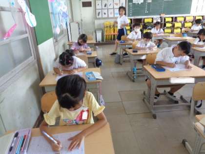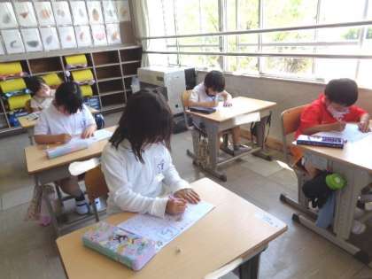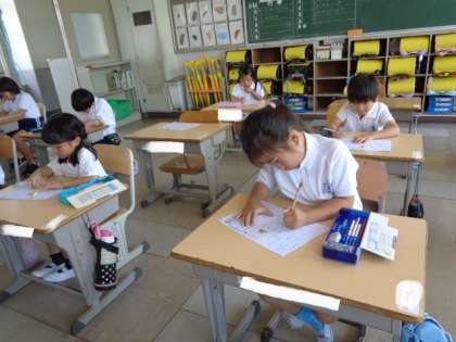 プリントを使って、ひらがなの練習です。 『ら』の字について、お手本を見ながらていねいに練習していました。