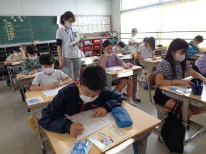 「しりたいことを聞き出そう」 単元のまとめテストです。 先生が読む文章を聞いて、問題に答えていました。