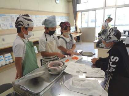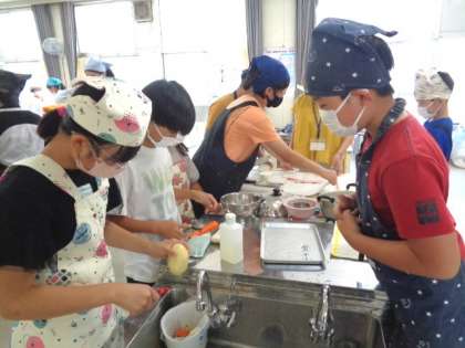 にんじん、玉ねぎ、ジャガイモ等、分担して包丁で切っていました。