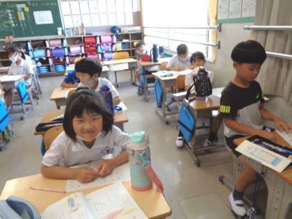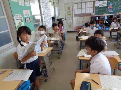 6/16 国語(2年生) 公開日 2023/06/16 更新日 2023/06/16 校長室から 「名前を見てちょうだい」 えっちゃんが、野原でだれにあったか、その人はどんな様子で何を言ったか、プリントに書きながら考え、みんなで発表し合っていました。