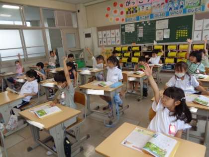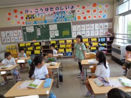 「たしざん」 教科書の問題に挑戦です。 問題文を読んで、どんな式になるか考えていました。