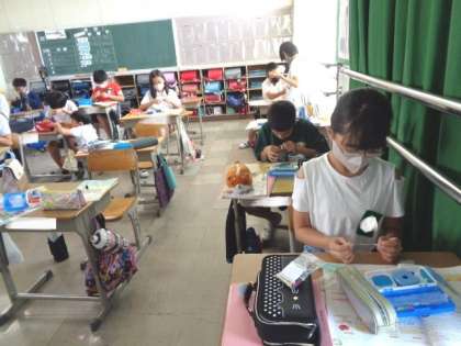 「ひと針に心をこめて」 手縫いに挑戦します。 針に糸を通し、玉結びをしてみていました。
