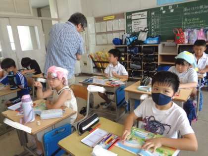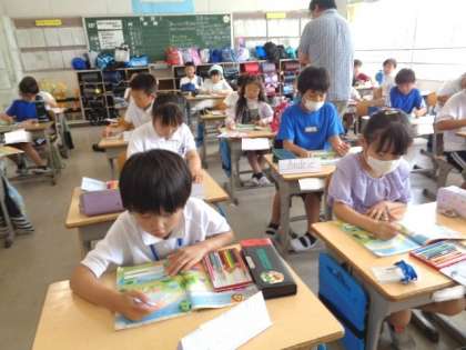 7/7 外国語活動(3年生) 公開日 2023/07/07 更新日 2023/07/07 校長室から 「I like blue.」 好きな色について英語で話す学習です。 まず。教科書の虹に色をぬって完成させていました。